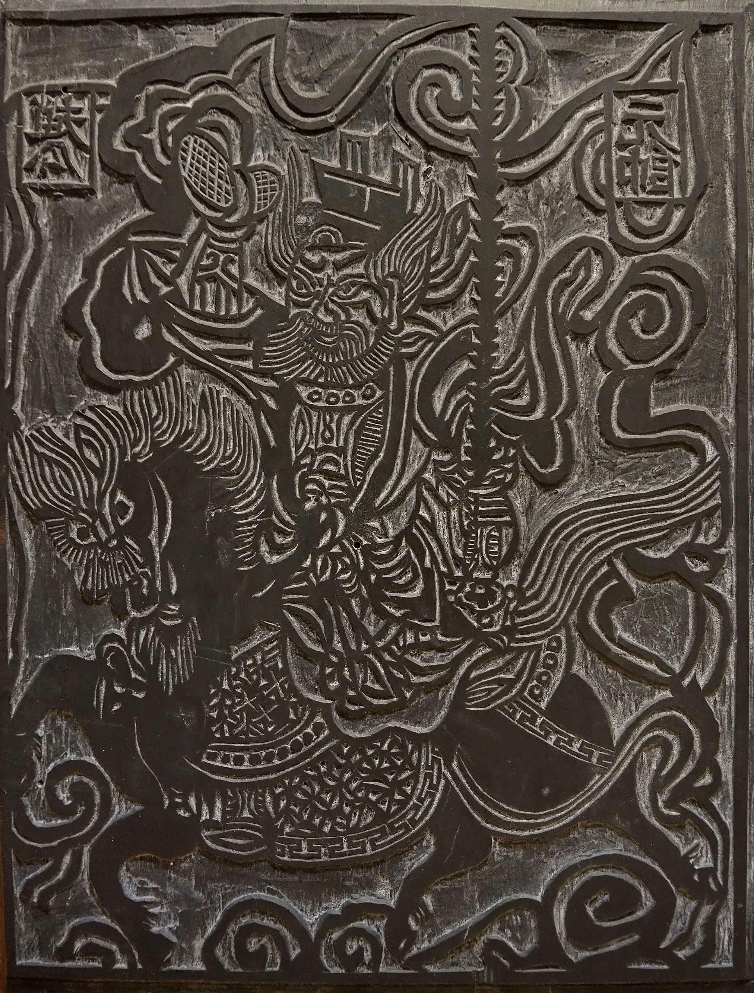 Unusual block showing the military god of wealth Zhao Gongming holding his normal cudgel and gold ingot, but riding a horse instead of a black tiger. The design is from the town of Heshun, outside Tengchong (腾冲和顺), right down in Yunnan’s far southwestern corner.