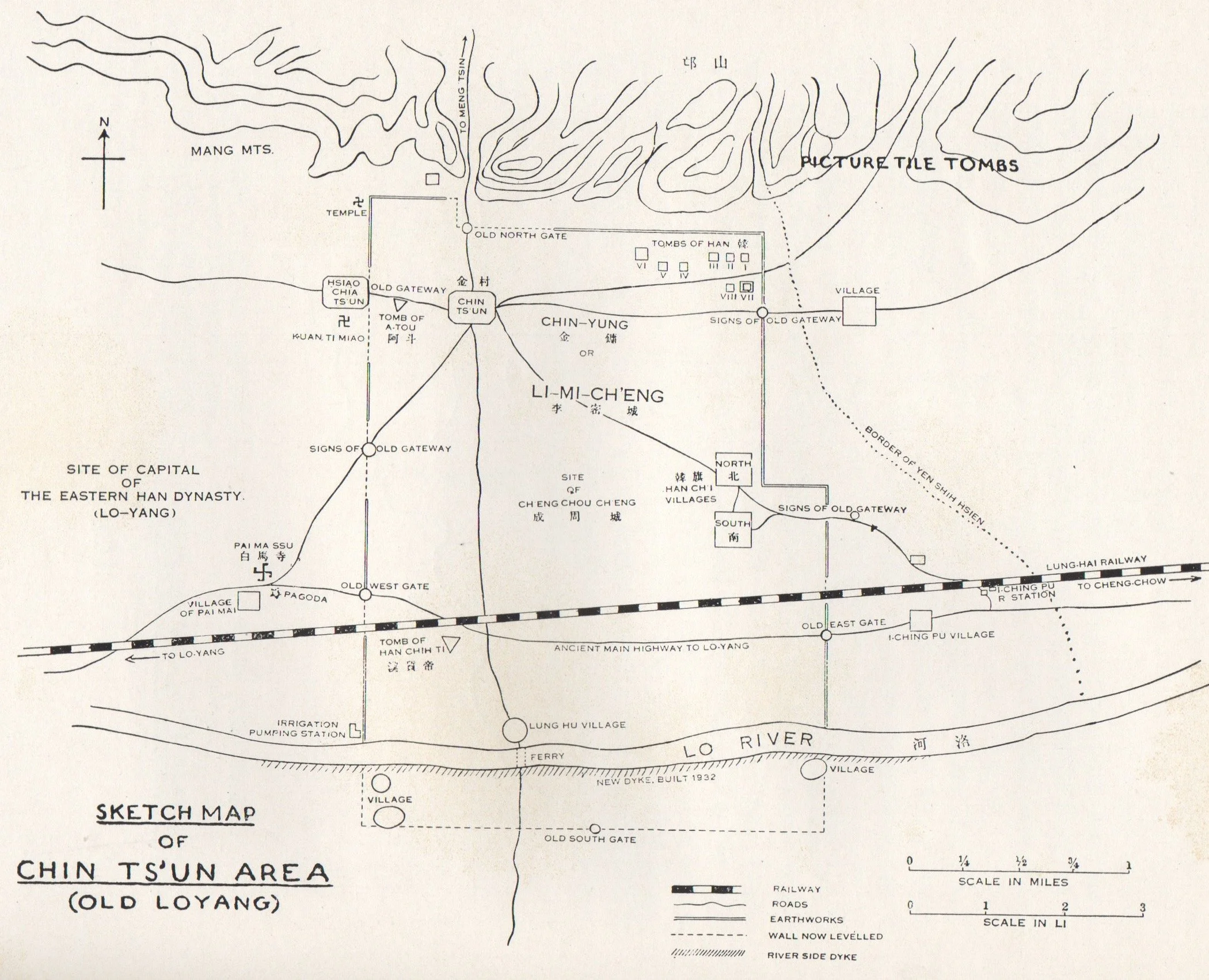 Map of Old Luoyang area, showing Jincun (Chin Tsun) and tombs. “Pai Ma Ssu” and the swastika on the left mark the Buddhist temple