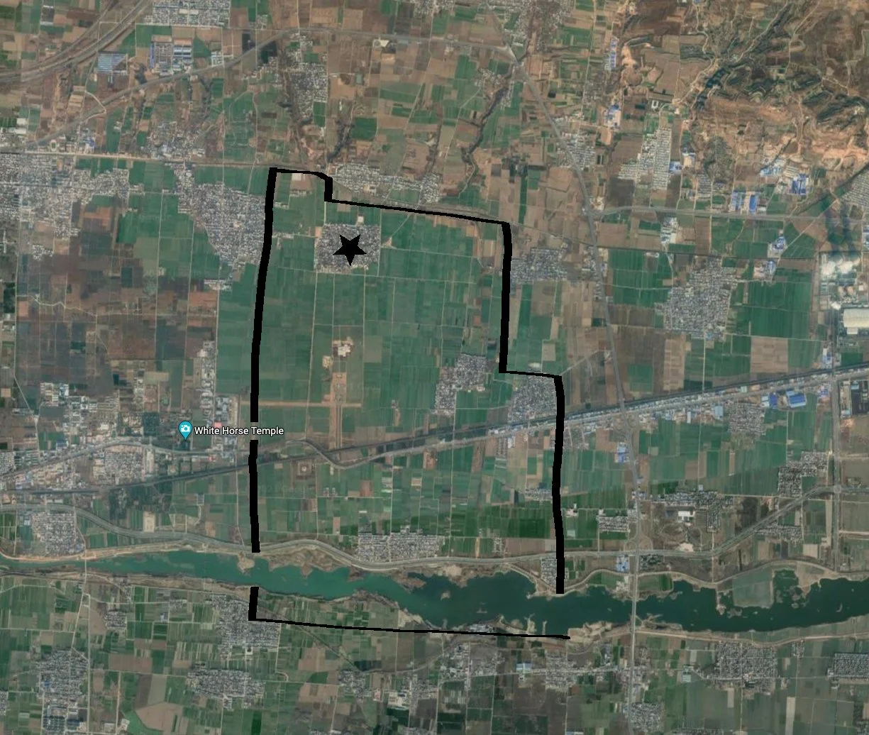 Goolge-eye view of Old Luoyang today, with line of old city walls drawn in (badly); the black star marks Jincun