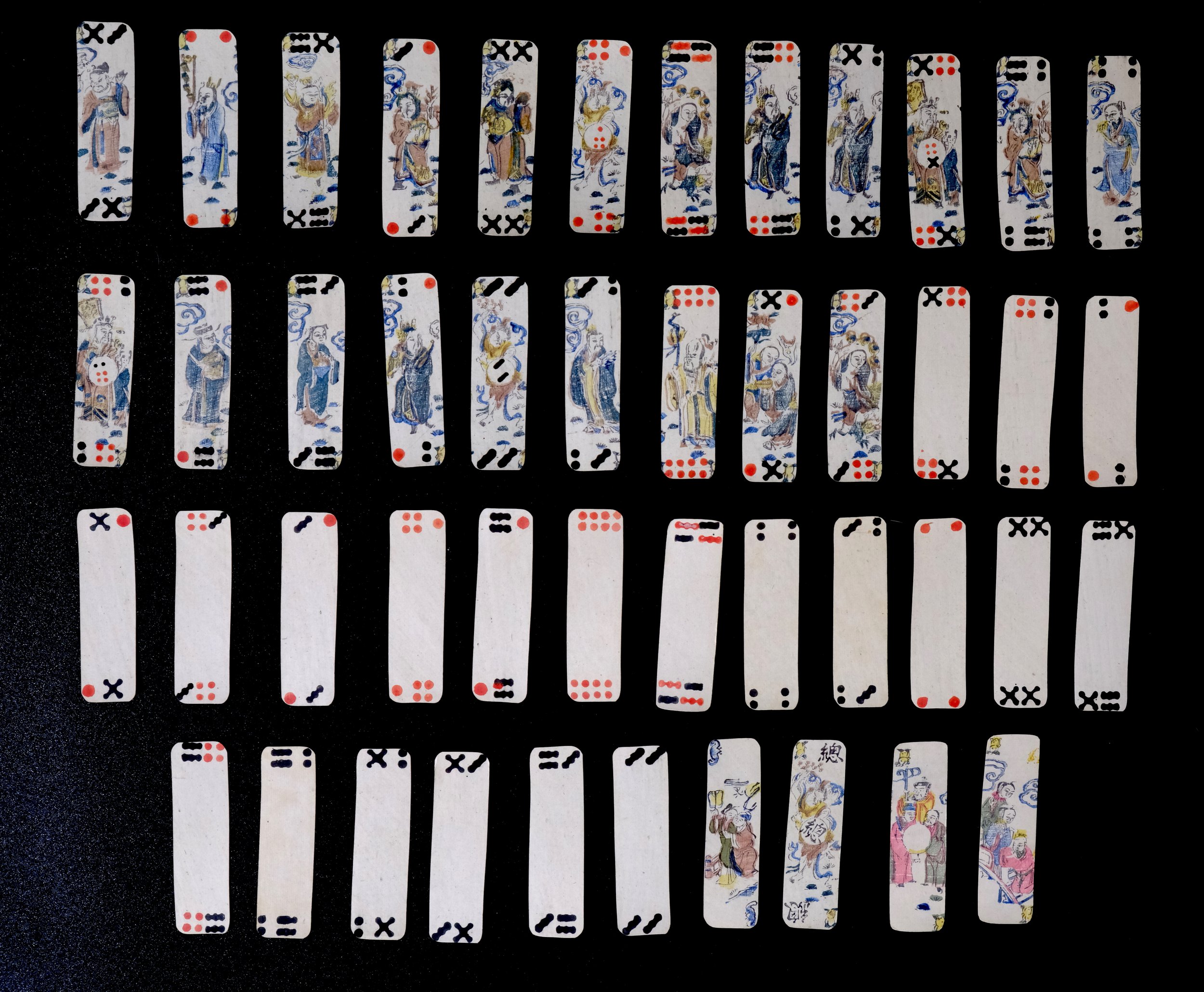 While some domino sets contain 84, 105 or even 126 cards, it’s possible this set of 46 is complete: the 21 plain cards with pips match the 21 with both pips and gods, and presumably the game involves collecting or discarding pairs. The four cards with gods alone are some kind of wild cards or jokers.