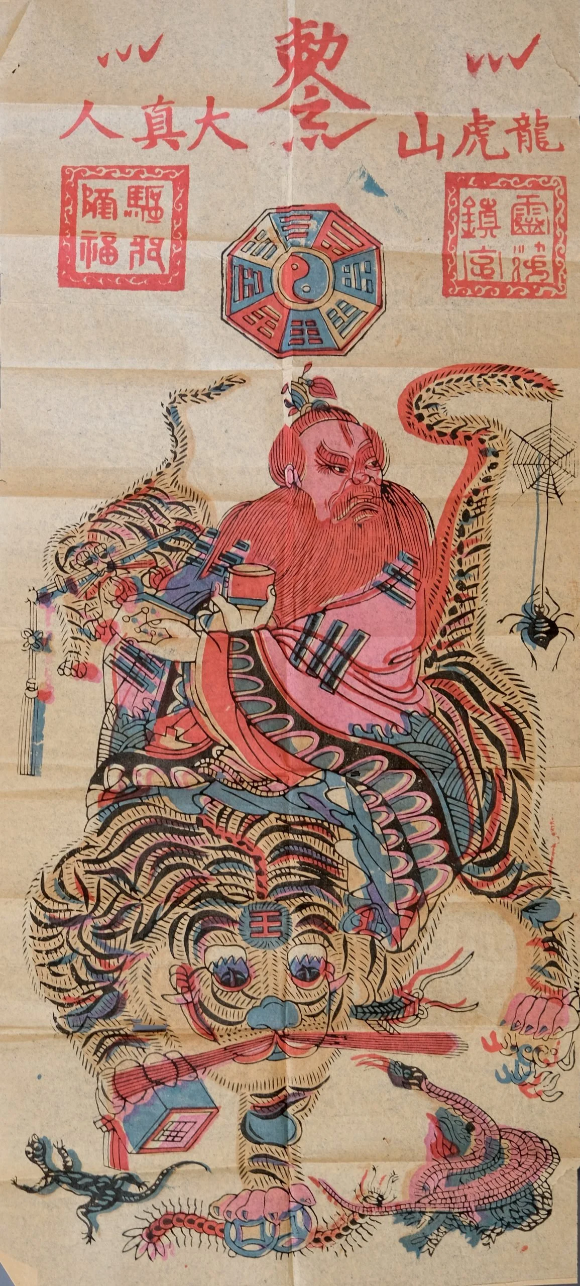 1927 print of Zhang Daoling and tiger suppressing the Five Poisons, issued in the name of Shangqing Palace. The design might reflect the story of his being enlightened by the long-haried mystic Liu Gen, who revealed the “Method of the Tiger Spirit” to Zhang