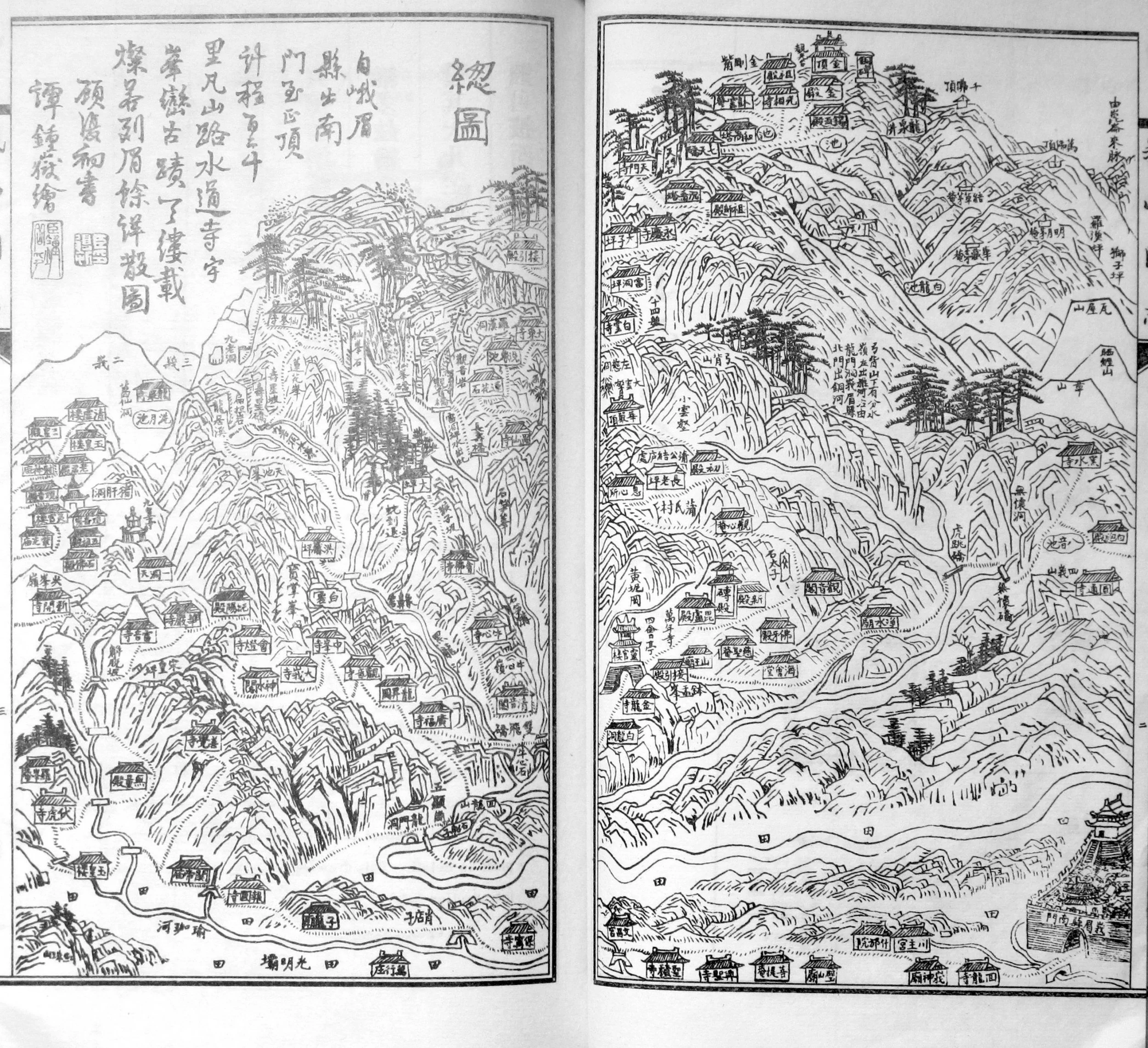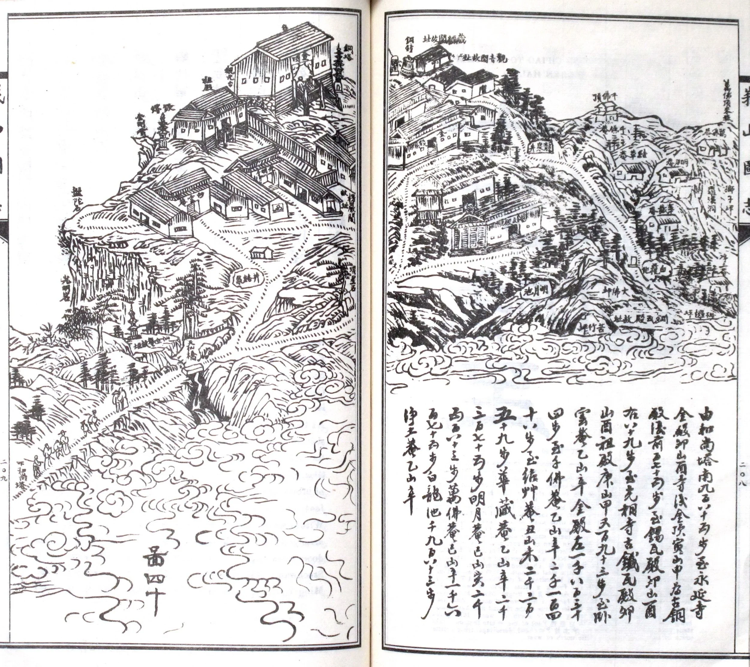 You Zhikai also found that official records of the mountain were incomplete. He commissioned Huang Shoufu and the scholar Liao Shengtang (廖笙堂) to gather information from folklore, personal experience and government documents. Meanwhile, artist and poet Tan Zhongyue (譚鍾嶽, also known as Tan Qingfeng, 譚晴峯) was sent to sketch the mountain’s buildings and scenery first-hand: “So, taking my brush along in its bag, I went, combing my hair with the wind and washing my head with the rain… Several times I met with tigers, who did me no harm… Half a year went by, and the pictures were finished.” Tan produced 53 illustrations of the main temples, with another 11 of famous scenes; he also wrote 46 short poems describing his impressions and experiences.