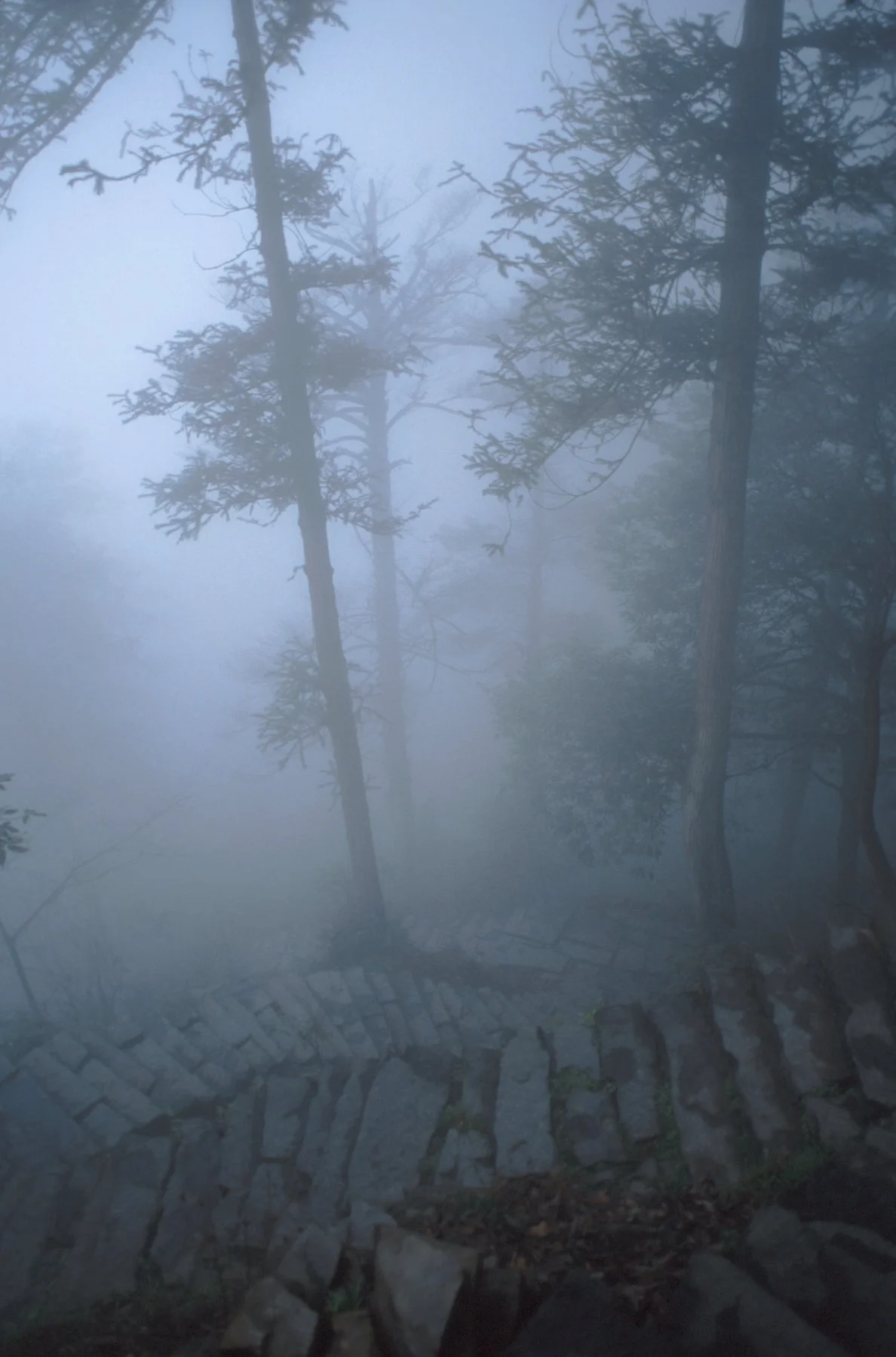 Overshadowed by tall trees and crags, gradients increase past Wannian with a 700m climb said to be so steep that as you crawl upwards your knees bang into your chest. At the top is Chu Hall(初殿), marking where Pugong found the hoofprints which led him to the summit and his vision of Puxian. From here “disordered hills rise vertically… sidling along, one advances some paces, and then ascending a risky tooth-like staircase, one seems to be climbing to heaven.” The next stop is Xixiang Chi (洗象池), a hexagonal stone-flagged pond where Puxian’s elephant went for a wash. The roof of the temple here is reinforced to cope with heavy winter snowfall.