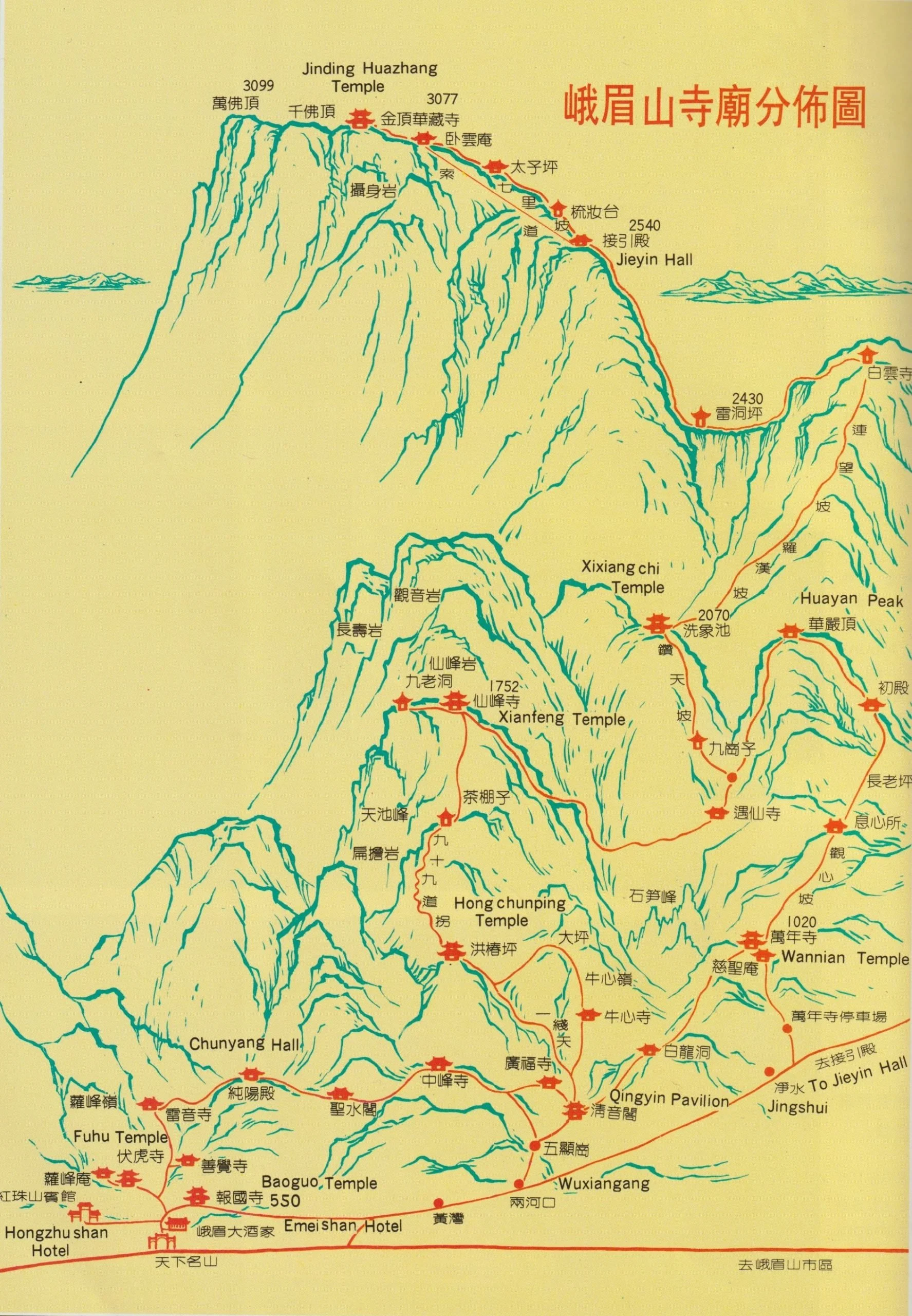 Tourist map of the mountain from 1990, showing about 30 temples still functioning