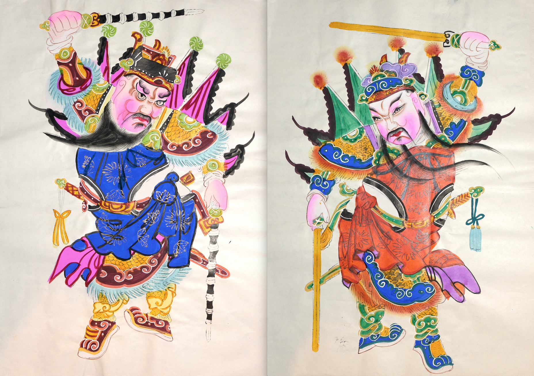 Civil door gods are generally anonymous and hold symbols bestowing wishes for high rank and salary. This pair however depict key characters and objects from the Sichuan opera “The White Cockatoo”.