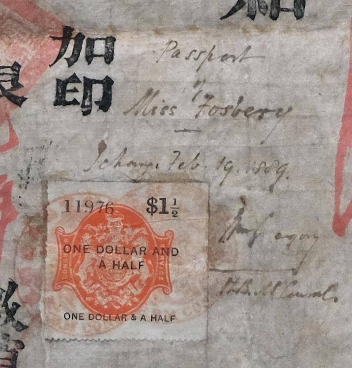 The passport is also stamped in red with the seal for “Her Britannic Majesty’s Consulate at Yichang”, and signed “Passport of Miss Fosbery – Ichang, Feb 19, 1889. William Gregory, HBM Consul”, with a receipt attached for $1.5.