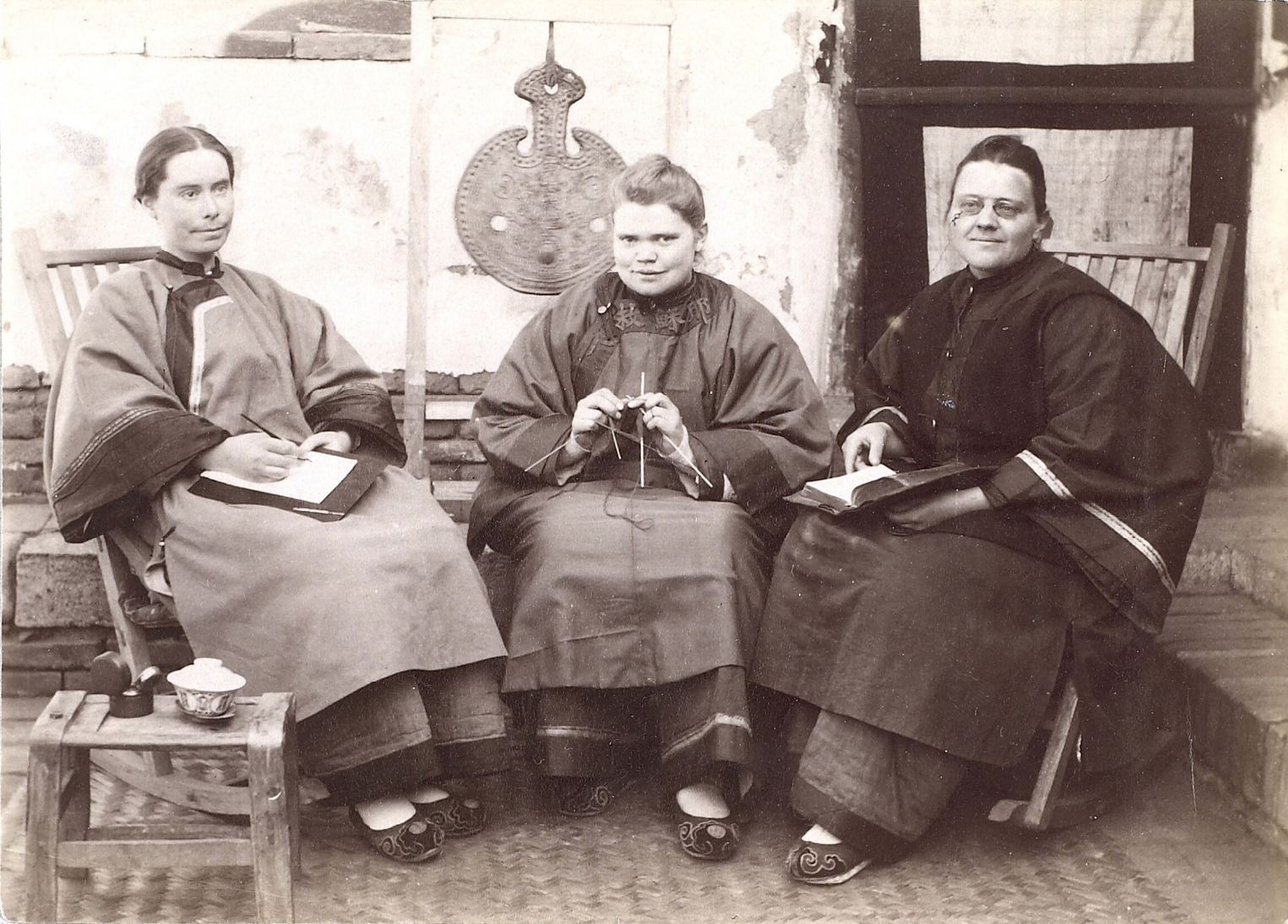 Three female CIM missionaries dressed in ordinary Chinese clothing; the embroidery on the middle missionary’s collar reads 那穌救, “Jesus Saves”. Photo by Isabella Bird c.1895; location unknown