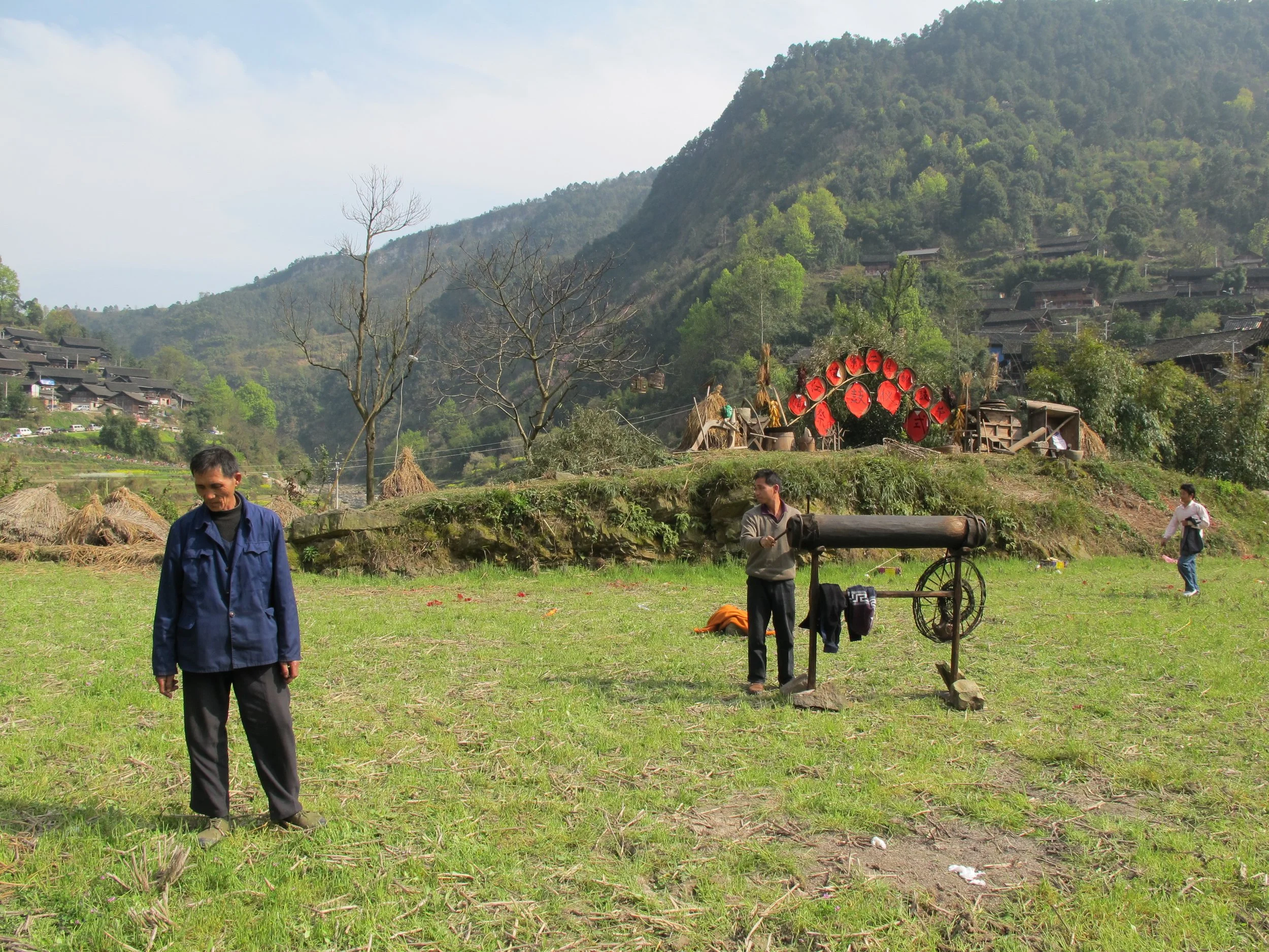 In a field on the far side of the river stood the drum itself, a long cylinder of wood fixed on its side in a frame. It was being overseen by the village shaman – the drum master – and his son. Miao festivals always involve a heavy intake of rice wine, and both men were extremely drunk, the drum master barely able to stand. As his son tapped away on the wood, the shaman told me the drum had been looked after by his family for eighteen generations.