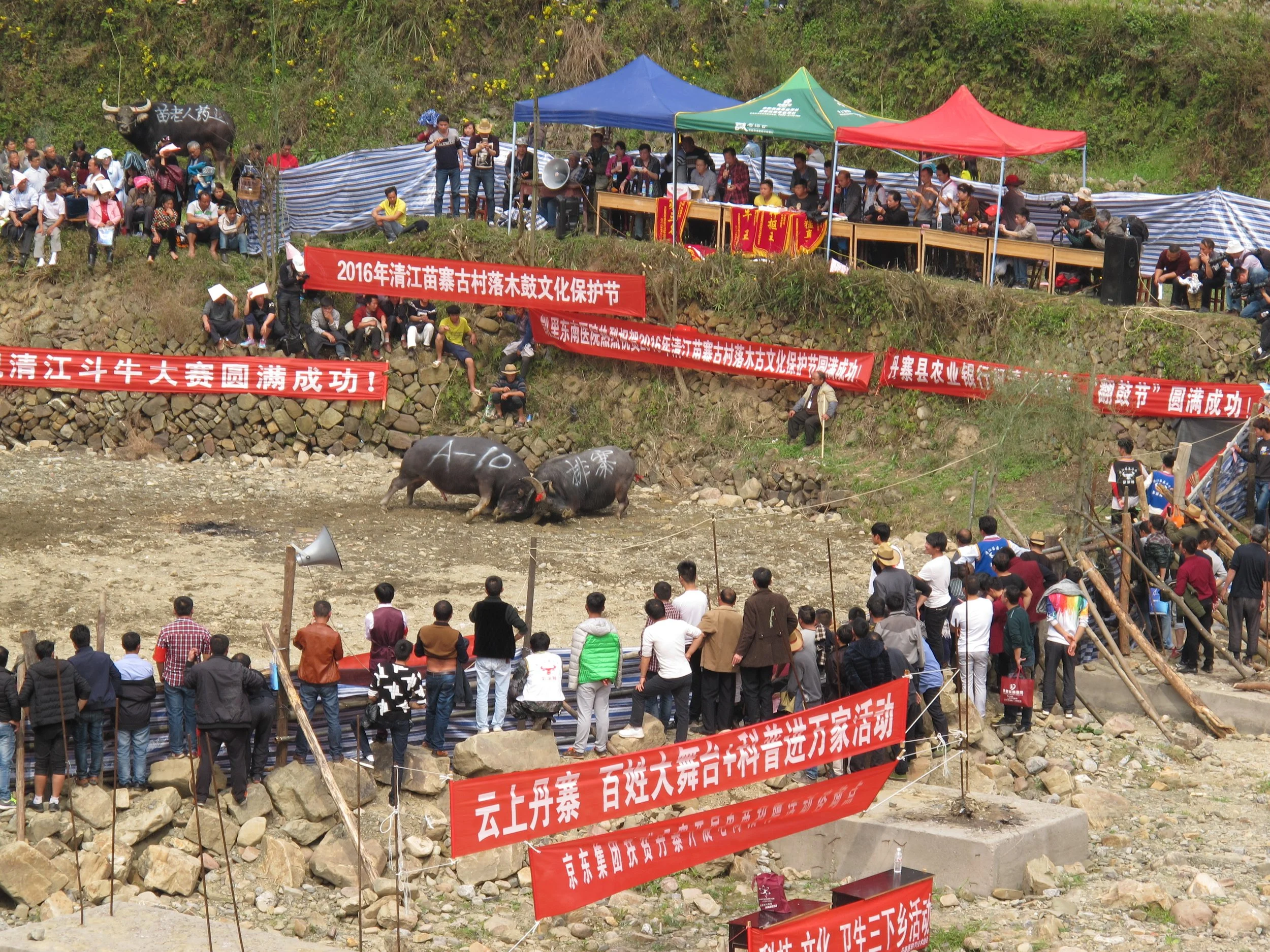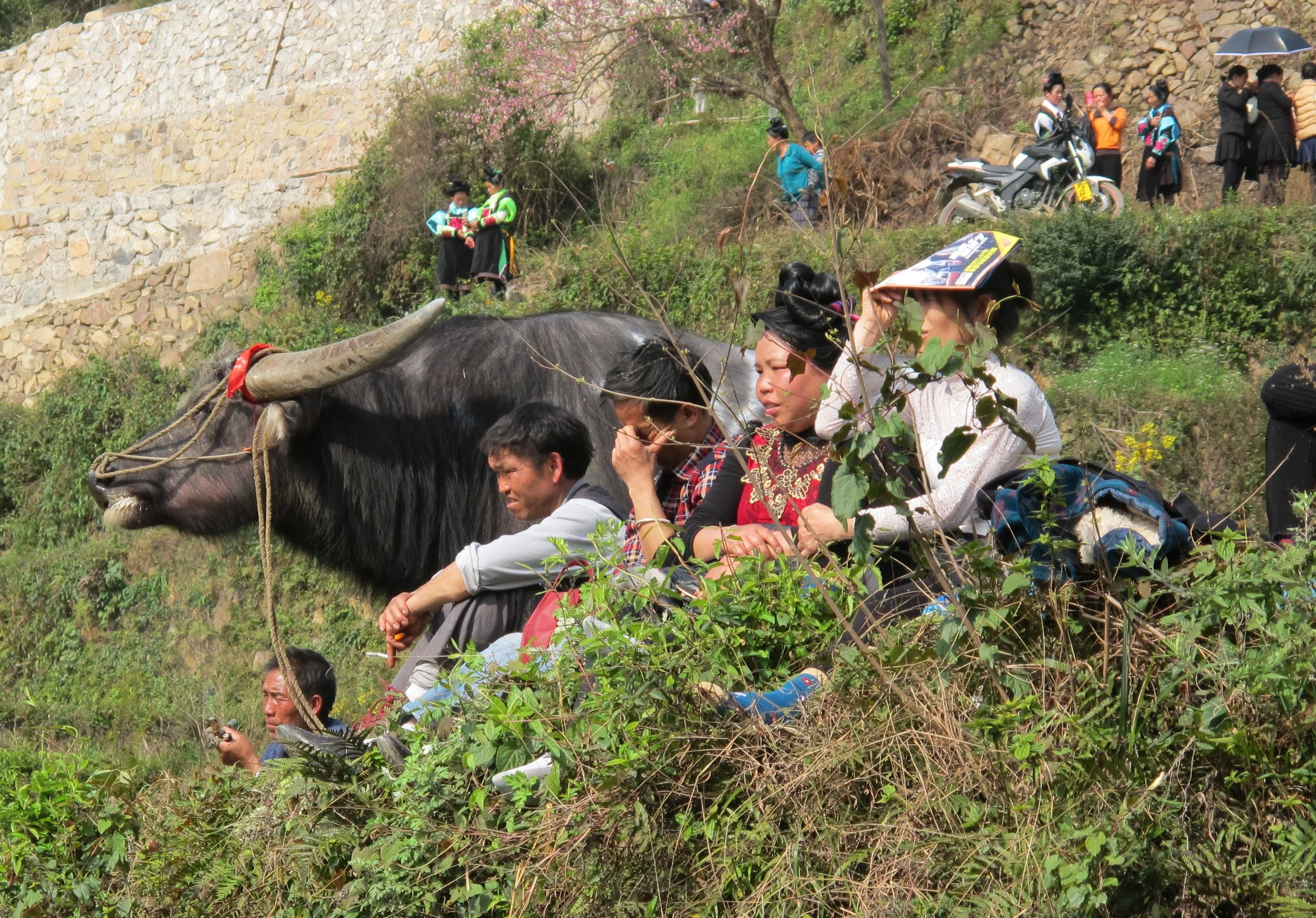 Miao love their buffalos and there’s none of the bloodlust of Spanish bullfighting. If the contestants seem evenly matched or there’s any bloodshed, handlers jump in to rope the buffalos’ hind legs and separate them with sticks. Inbetween fights, owners take their buffalos down to a deep waterhole to groom and pimp them with red ribbons, and let the beasts cool off. One family even had their prize bull sitting with them in the grassy terrace overlooking the battleground.