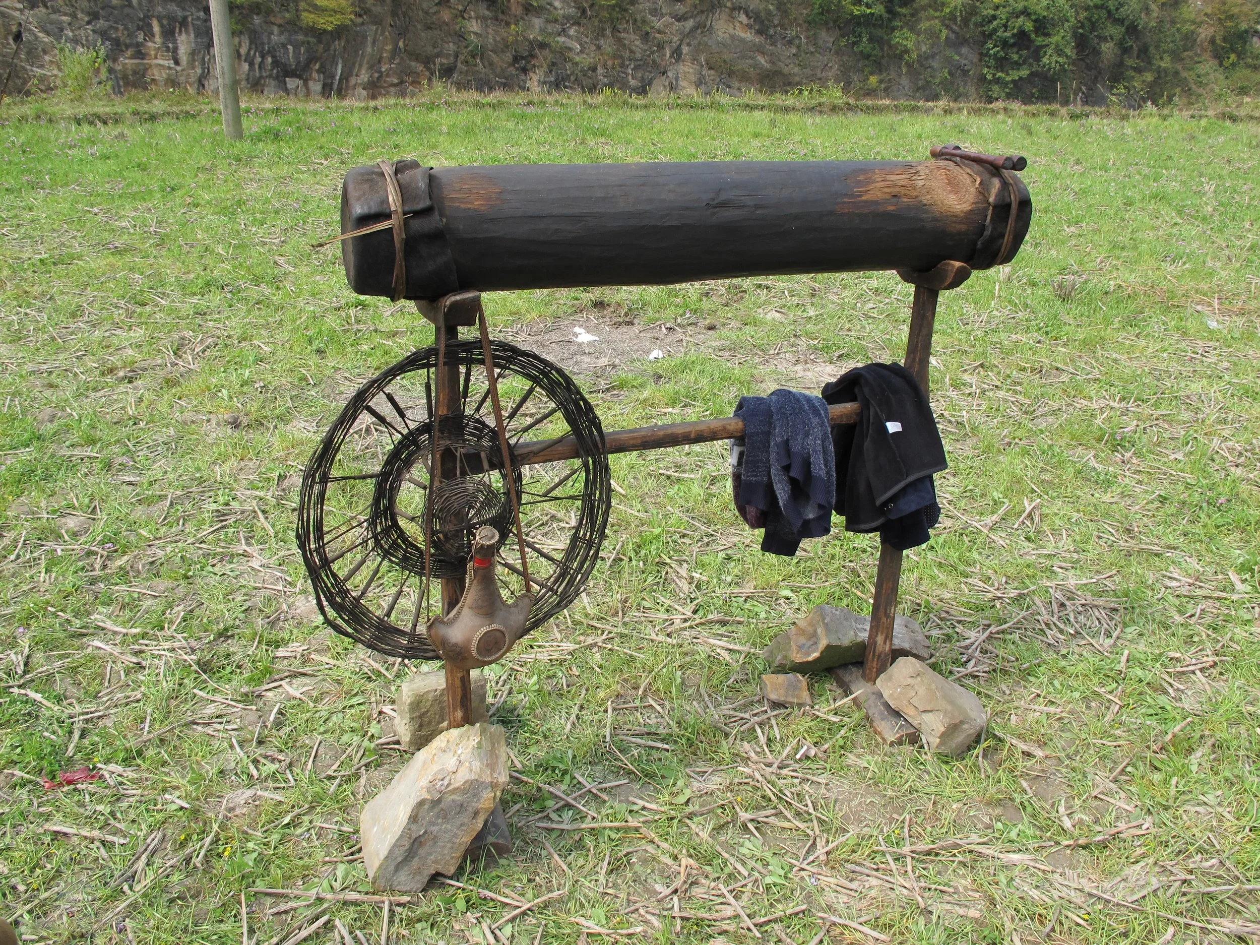 Qinglang village’s wooden drum, with buffalo-hide tympanum. Note the essential wine flask hanging on the strap…