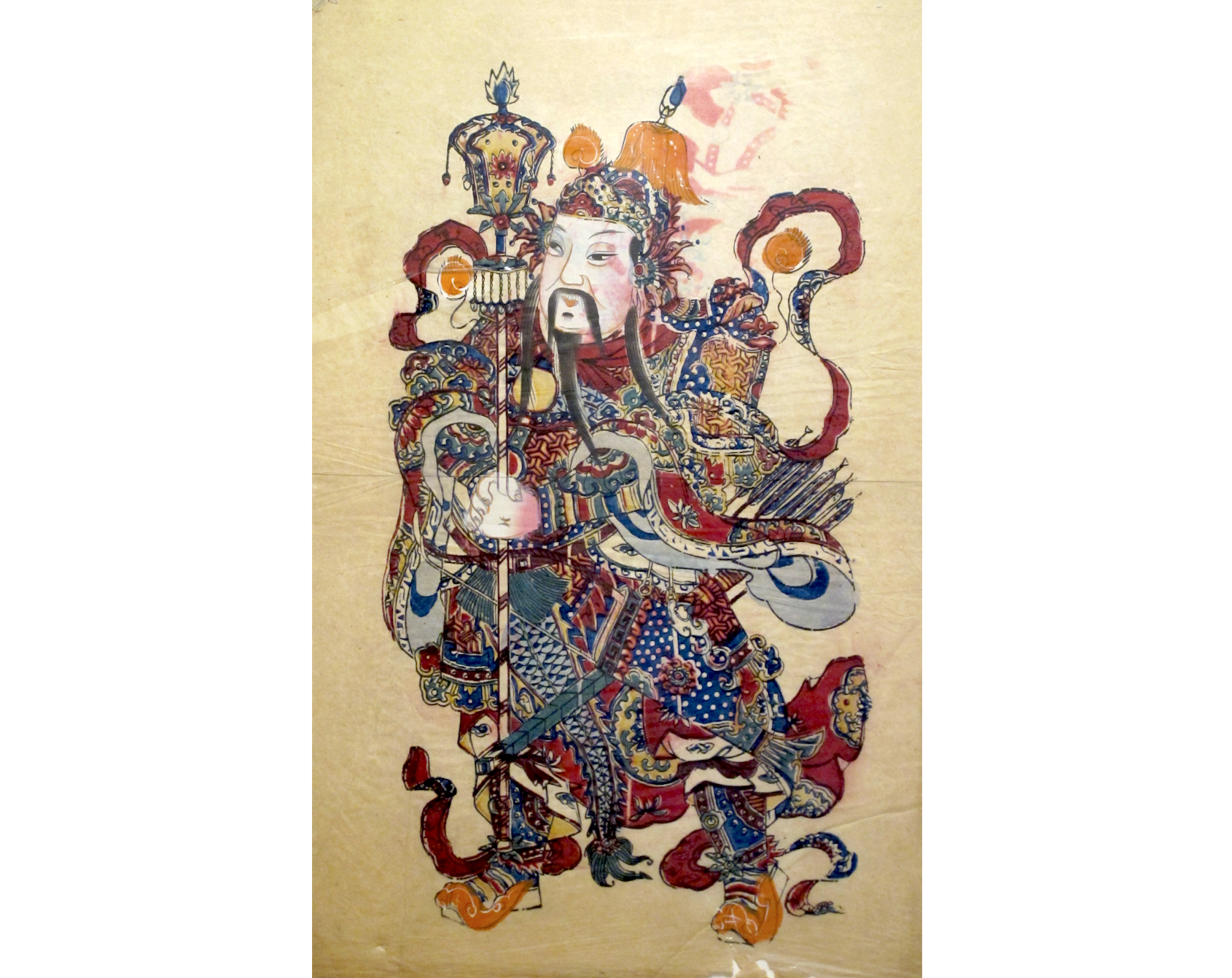 Here’s a door god from Yangliuqing, the prolific woodblock printing village west of Tianjin in Hebei province. It would originally have been one of a pair – the other being a warrior facing right, with bulging eyes and red face.