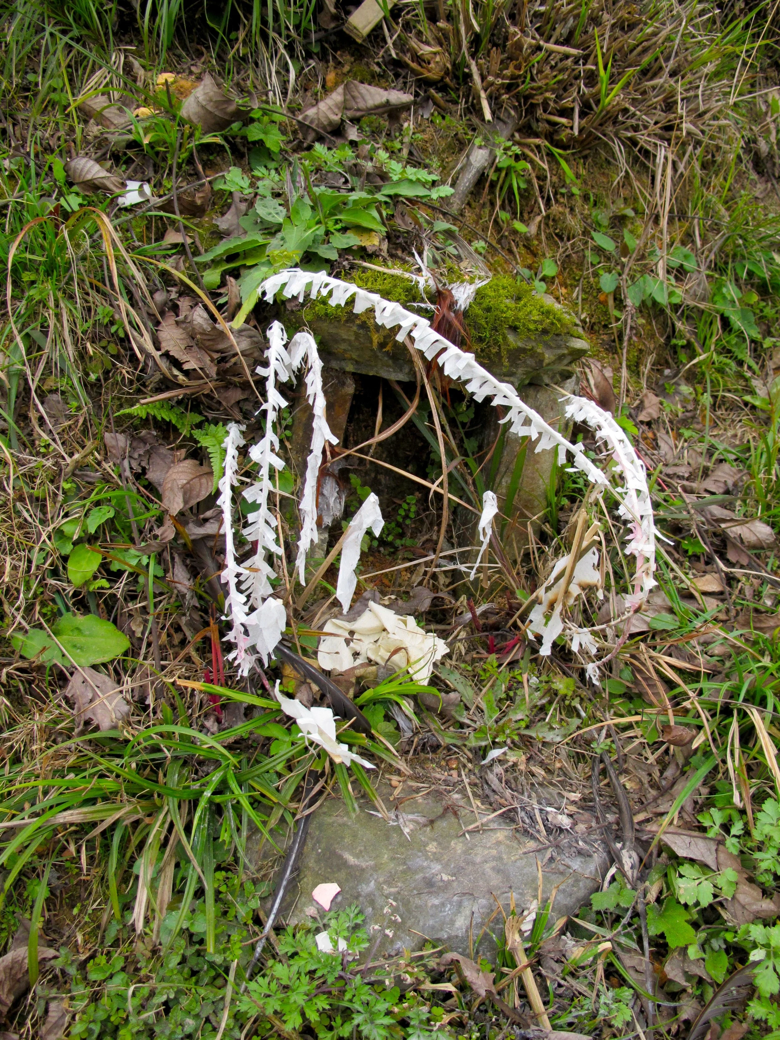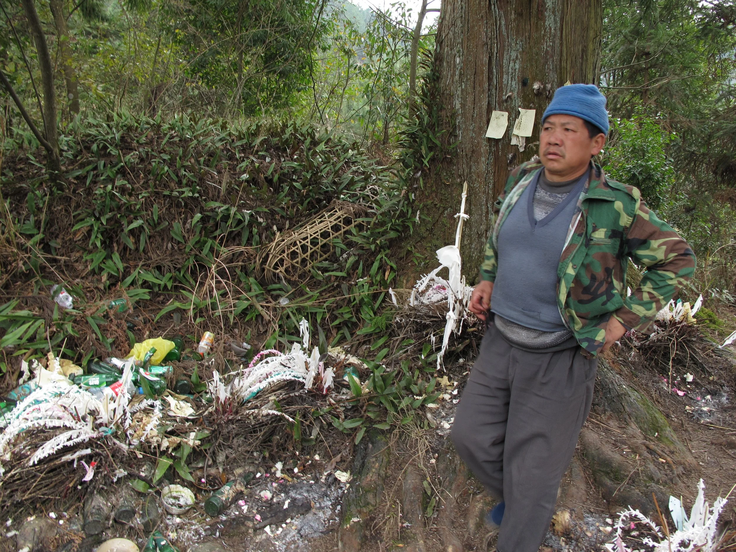 During a lull in the proceedings I was taken into the pine grove, where many of the trees were tied with red ribbons as a sign of respect for their age – something you can see across southern China. And in amongst the grove was a fern-covered boulder surrounded by an untidy flotsam of more paper arches and (empty) bottles of beer. All around were little piles of burned debris, making the whole place look like a cross between a popular bbq site and a shrine. People come here to pray to the spirits for offspring and to cure sickness.