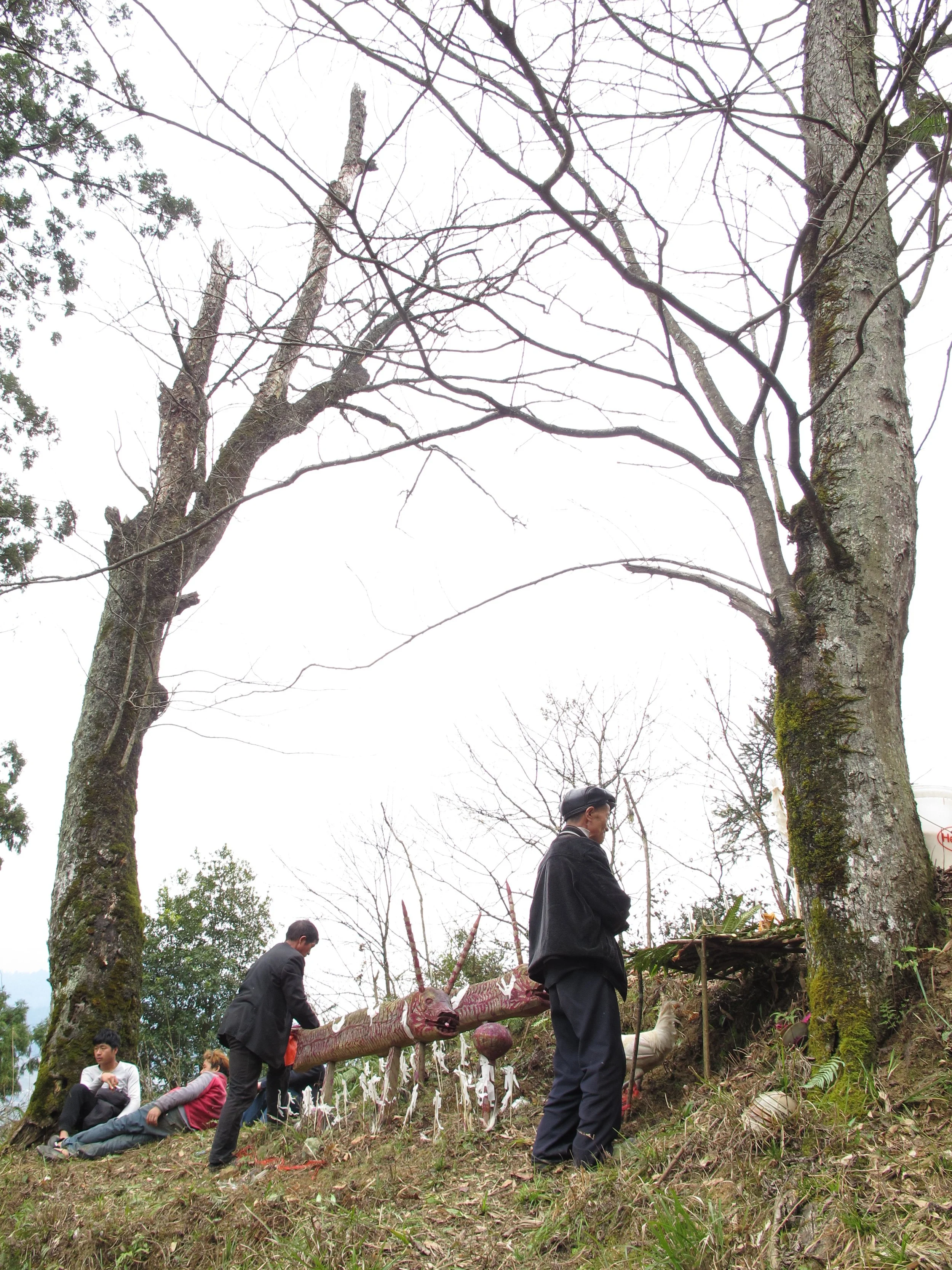 At the event I saw, the shaman and his entourage returned down off the mountain two hours late – the usual shaman was busy elsewhere and Kaitun had borrowed this one from another village, who wasn’t familiar with local paths and got lost. The duck was led around the ring and then slaughtered and its blood sprinkled over the dragons, along with handfuls of feathers; its corpse was taken away to be cooked. Then the shaman began the first of three prayer recitals summoning the dragon; recordings were absolutely forbidden as playing them might call the dragon down at an inappropriate time, bringing disaster. The rooster was sacrificed next, then the second recital began.