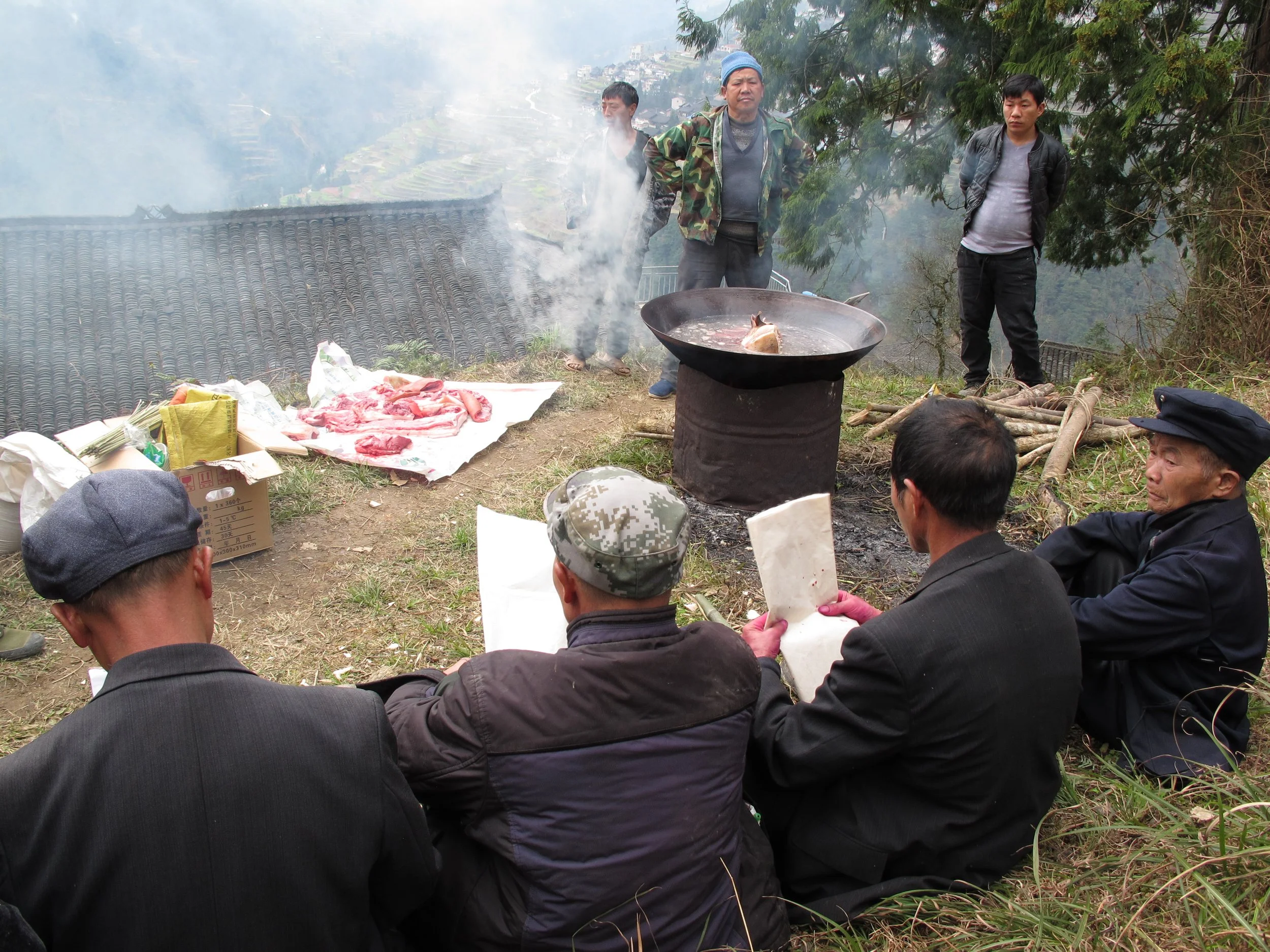 Earlier on, a pig had been butchered and was being stewed up in pieces in a huge wok under the trees. Once the recitals were over the whole village gathered to eat the pork – this was part of the ceremony I wasn’t allowed to attend – and then the paper children were handed out to villagers to be put up in their homes.