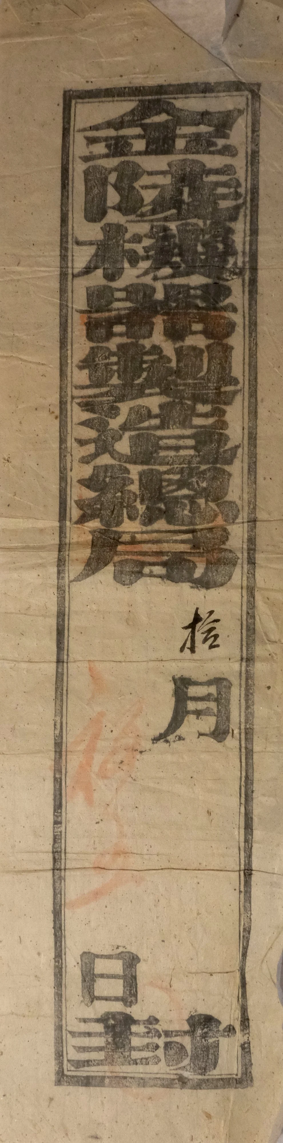 A receipt, late nineteenth century, reading 金陵机器製造總局 拾 月 初五 日封 (Jinling Machinery Manufacturing Bureau; Fifth day of the tenth lunar month)