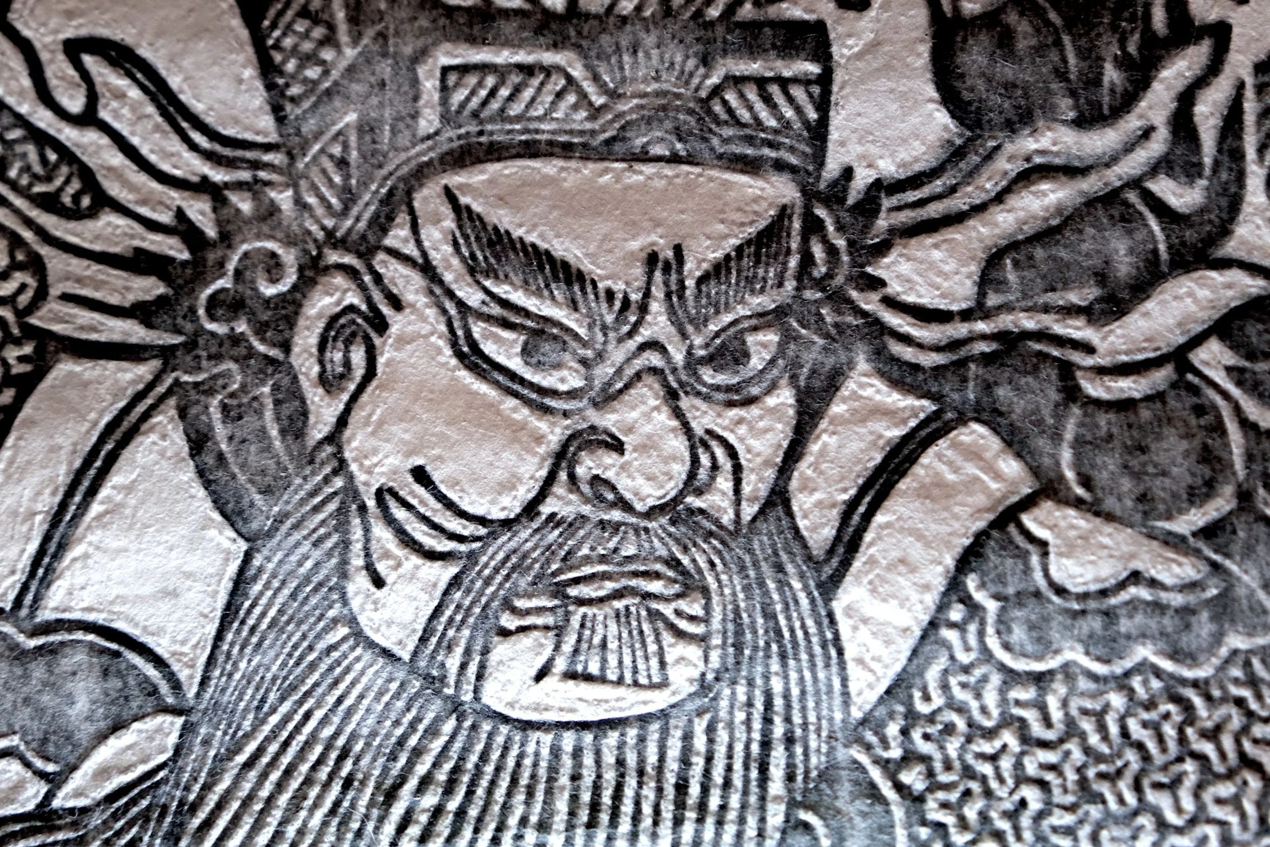 My rubbings – bought from the shop Mountain Folkcraft in Hong Kong, who acquired them in the pre-earthquake 1990s – include the two half-sized examples of Zhong Kui and Zhao Gongming, probably from blocks cut in the late 1980s. The rest are modern rubbings from large (over a metre tall) nineteenth-century blocks, several of which show age-related damage. The Hong Kong Baptist University Library, which has a collection of these recent rubbings, suggests that they are the work of Mianzhu master printmaker Chen Xuezhang (陳學彰, born 1947) and his son Chen Jian (陳建, born 1970, who also worked with another master, Zhang Xianfu 张先富).