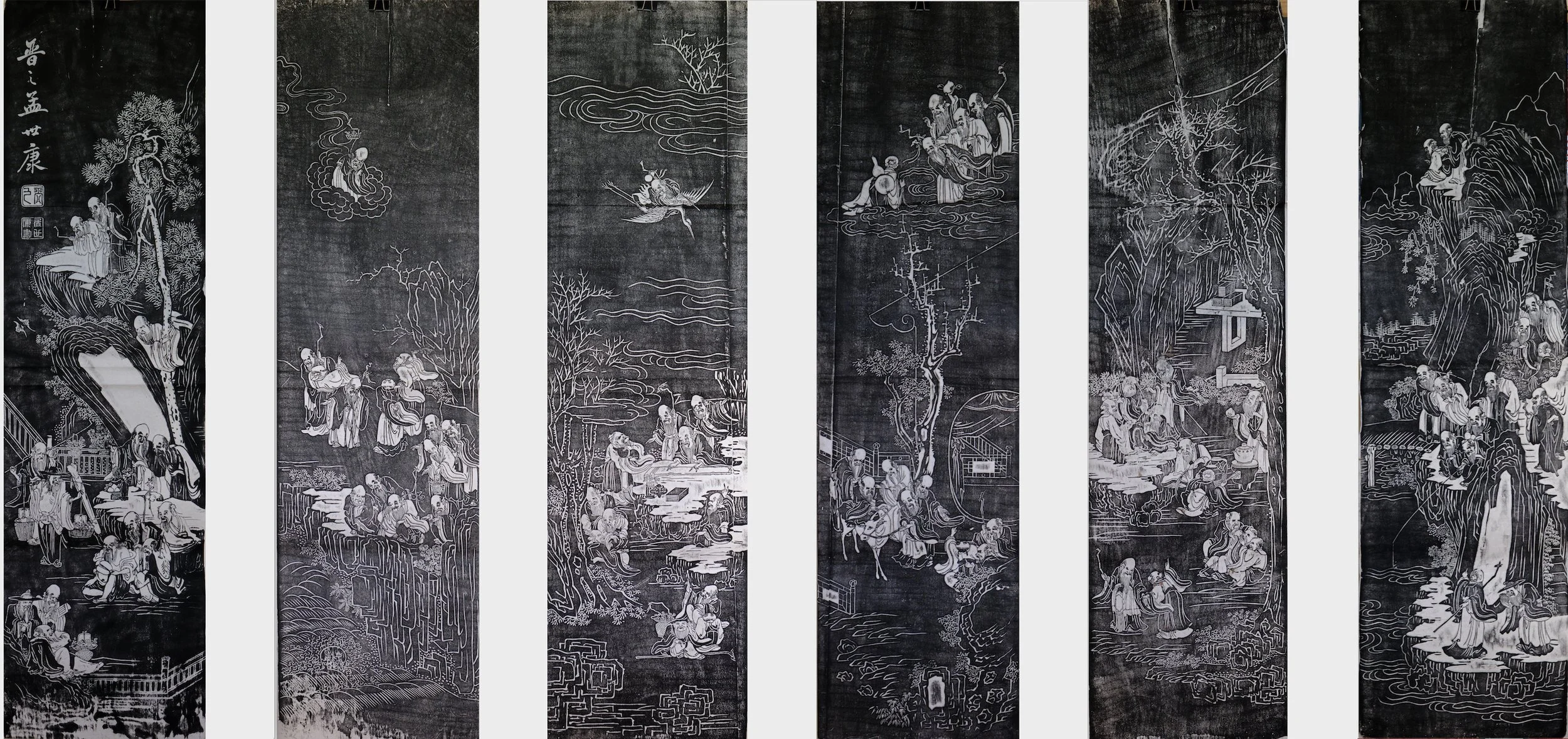 One Hundred Old Men, or One Hundred Immortals, 百壽圖/百仙圖. Six out of a set of eight; from the left, numbers 2 & 3 are missing. Signed by the nineteenth-century artist Meng Shikang (孟世康), about whom almost nothing is known. All these rubbings show age-related damage to the original blocks.