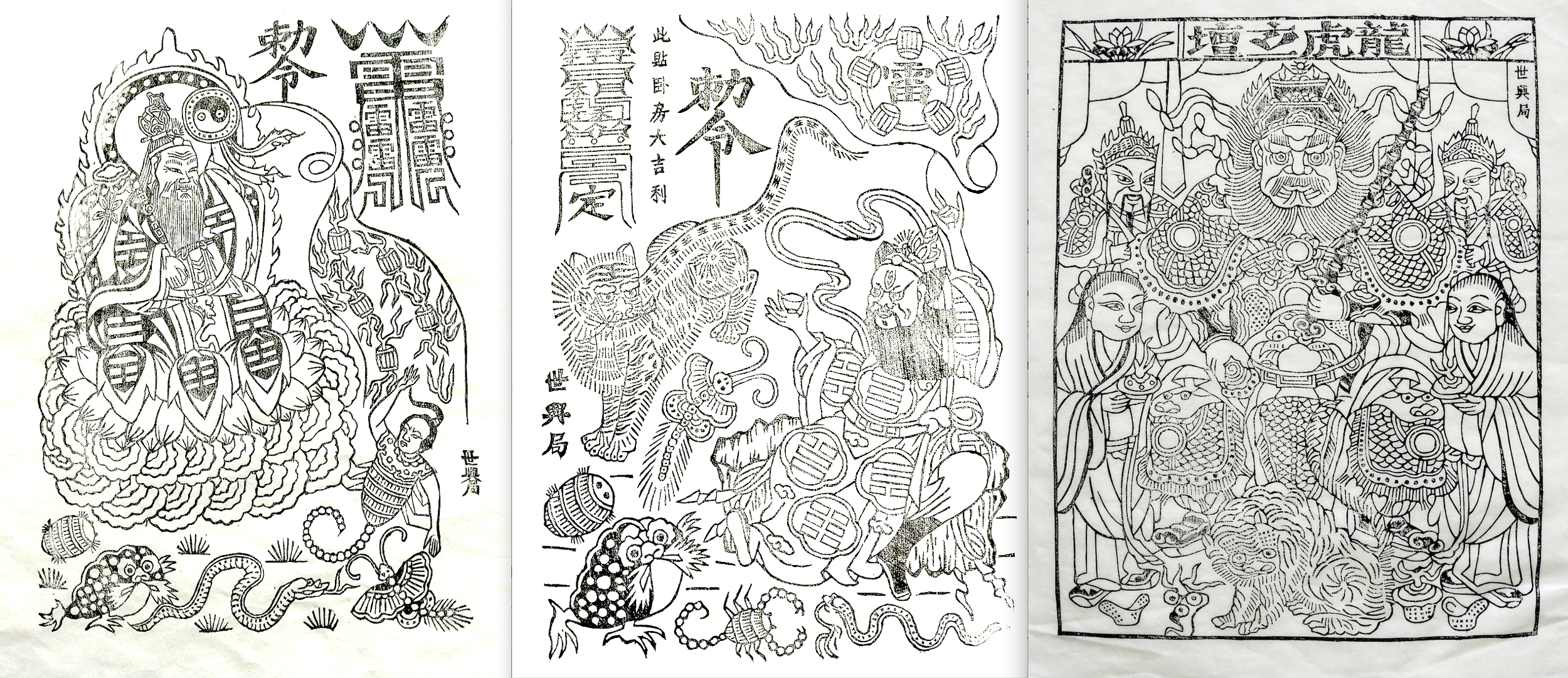 Three deity prints: Laozi (left) and Zhang Daoling with his tiger (centre), both using Five Thunder magic to defeat four “poisons” (snake, scorpion, toad, insect), with possibly Zhang Daoling again at right, master of the Dragon-Tiger Altar (Dragon-Tiger Mountain in Jiangxi province is the centre for his cult). Alternatively it could be Zhao Gongming, the military god of wealth